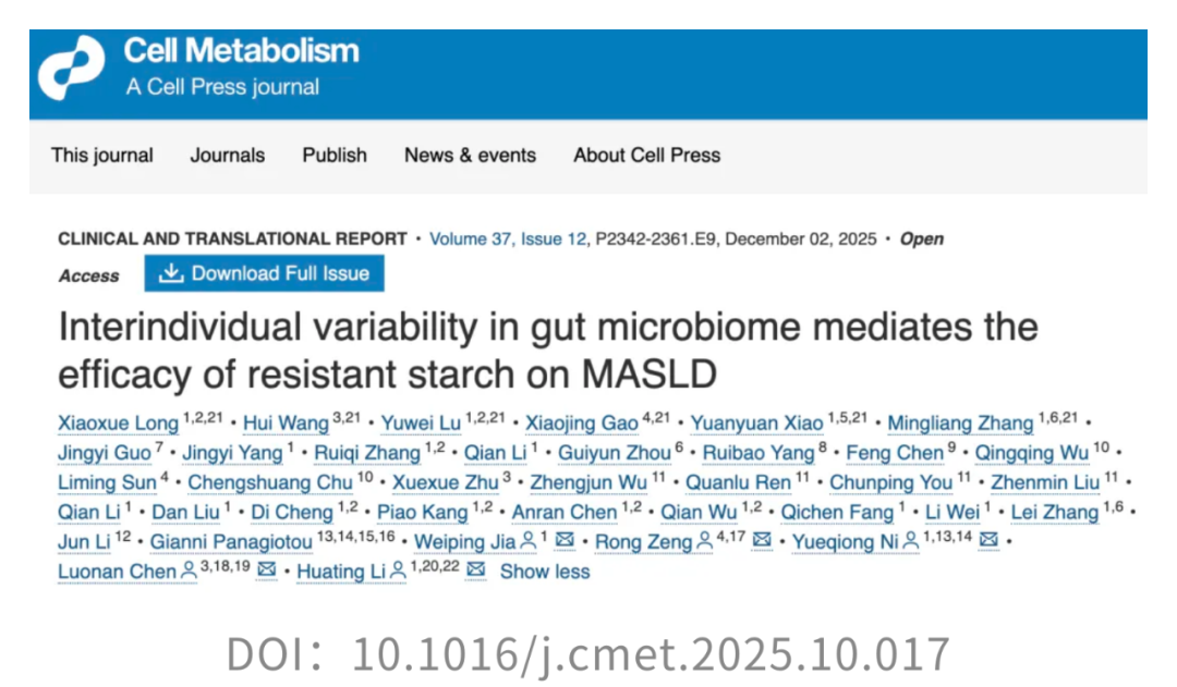 [1]Long X, Wang H, Lu Y, Gao X, Xiao Y, Zhang M, Guo J, Yang J, Zhang R, Li Q, Zhou G, Yang R, Chen F, Wu Q, Sun L, Chu C, Zhu X, Wu Z, Ren Q, You C, Liu Z, Li Q, Liu D, Cheng D, Kang P, Chen A, Wu Q, Fang Q, Wei L, Zhang L, Li J, Panagiotou G, Jia W, Zeng R, Ni Y, Chen L, Li H. Interindividual variability in gut microbiome mediates the efficacy of resistant starch on MASLD. Cell Metab. 2025 Nov 20:S1550-4131(25)00477-2. doi: 10.1016/j.cmet.2025.10.017. Epub ahead of print. PMID: 41270737.
