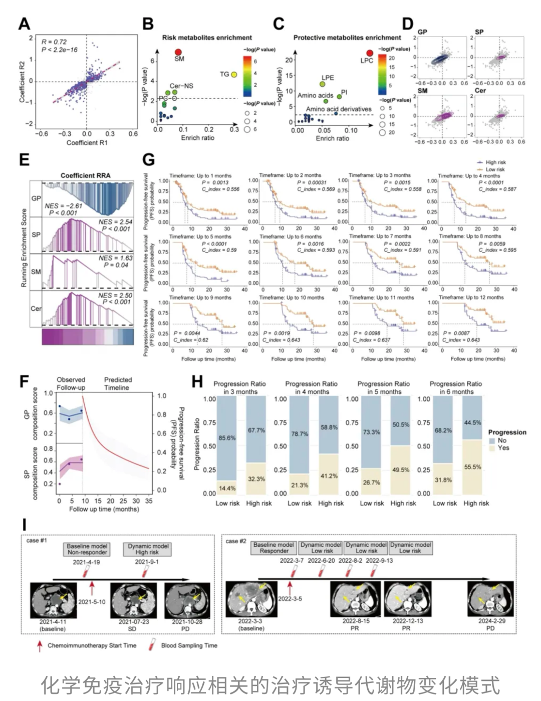 通过对这些样本进行代谢组学分析,他们发现,治疗过程中代谢物的变化,本身就是一张「实时疗效监测图」,能够反映他们对化疗联合免疫治疗的反应情况。随着治疗不断推进,鞘磷脂在疗效不佳/进展高风险患者的血浆中逐渐积累,而甘油磷脂水平在治疗有效患者中显著更高。