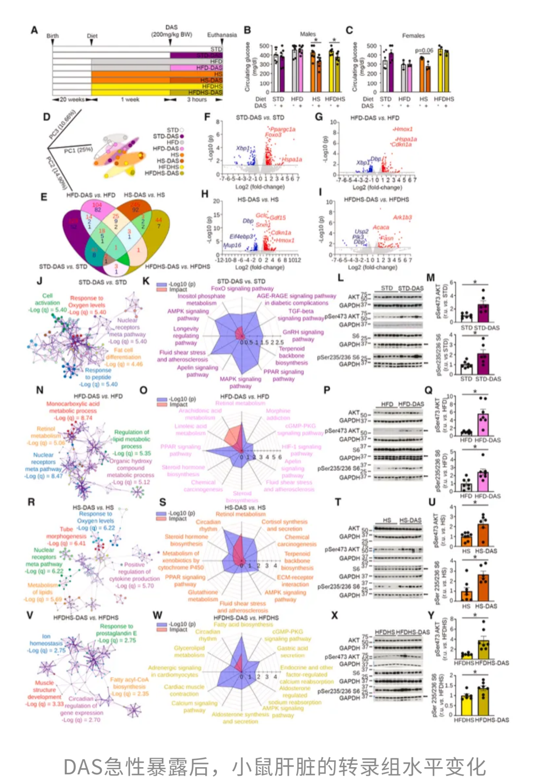 结果表明,仅仅一周时间,高脂高蔗糖饮食的小鼠肝脏就已经出现重量增加的迹象。但在不同饮食背景下,DAS都能显著提升体内H₂S的生成能力。尤其是在高蔗糖或高脂高蔗糖饮食条件下,它还能明显降低血糖水平;而在正常饮食条件下,DAS甚至可以激活与抗衰老密切相关的FoxO信号通路。