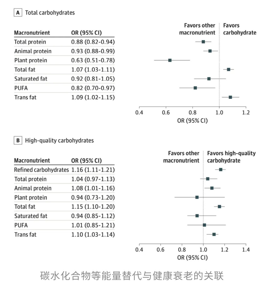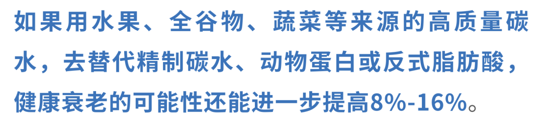 研究发现,当总碳水化合物摄入量占总能量的50%-55%时,人群健康衰老的可能性最高。真正决定差距的,不只是「吃了多少」,更是「吃了什么」。每增加10%能量的高质量碳水化合物(比如全谷物、水果、蔬菜和豆类),健康衰老的可能性就会上升31%;相反,如果增加的是精制碳水化合物,那么健康衰老的可能性反而会下降13%。