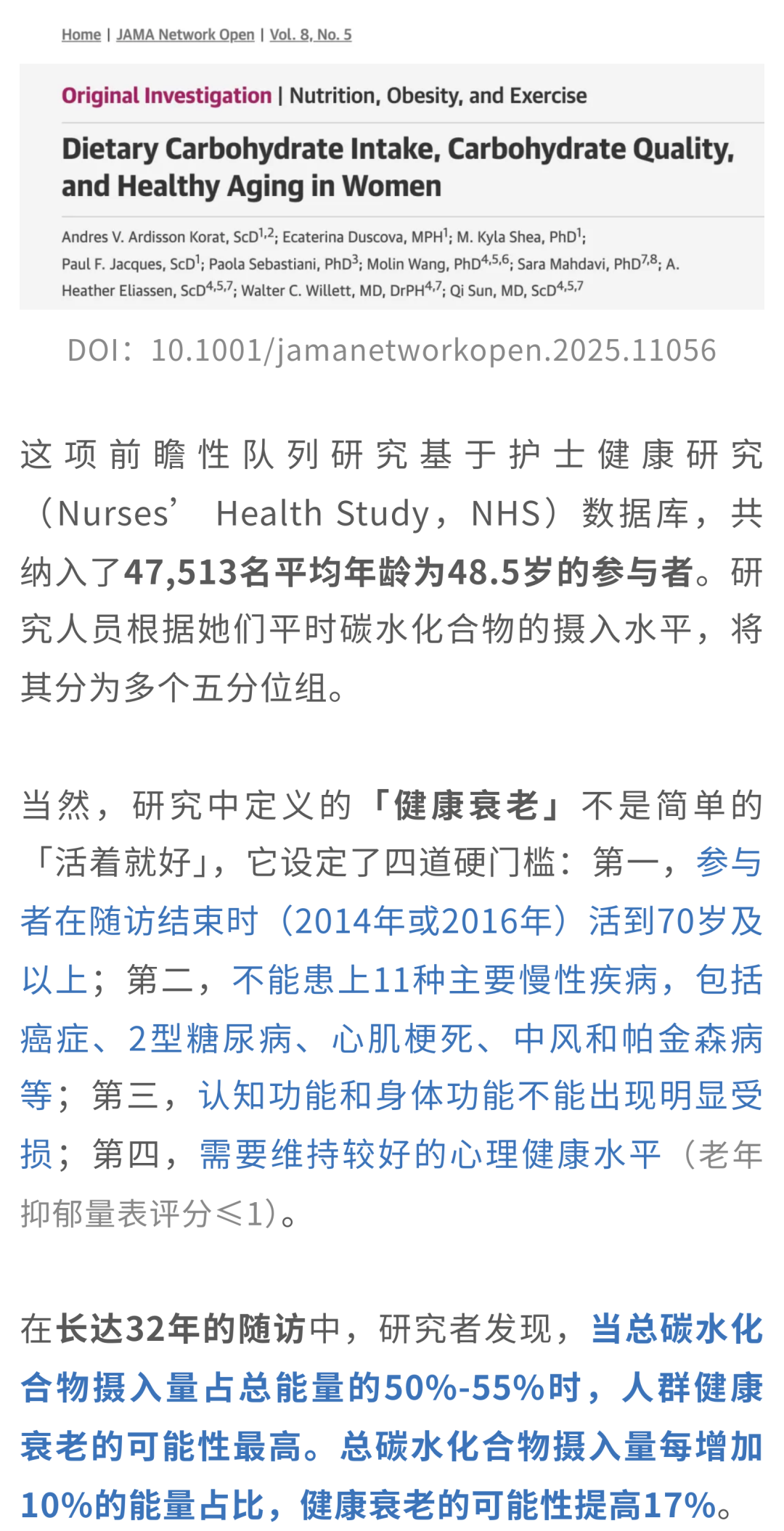 [2]Ardisson Korat AV, Duscova E, Shea MK, Jacques PF, Sebastiani P, Wang M, Mahdavi S, Eliassen AH, Willett WC, Sun Q. Dietary Carbohydrate Intake, Carbohydrate Quality, and Healthy Aging in Women. JAMA Netw Open. 2025 May 1;8(5):e2511056. doi: 10.1001/jamanetworkopen.2025.11056. PMID: 40377936; PMCID: PMC12084844.