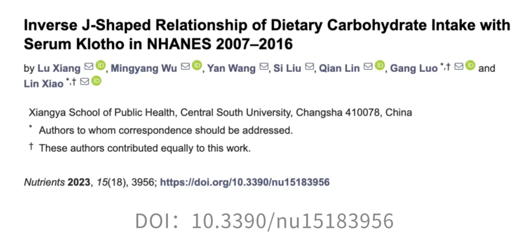 [1]Xiang L, Wu M, Wang Y, Liu S, Lin Q, Luo G, Xiao L. Inverse J-Shaped Relationship of Dietary Carbohydrate Intake with Serum Klotho in NHANES 2007–2016.Nutrients. 2023; 15(18):3956. https://doi.org/10.3390/nu15183956